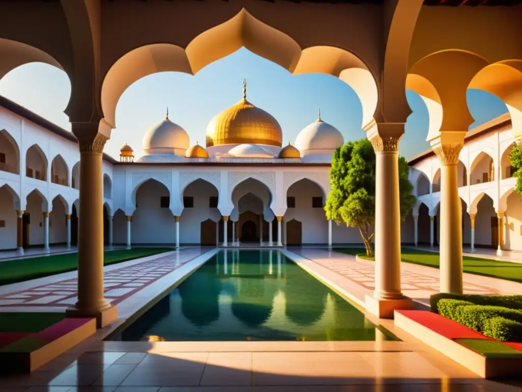 Un atardecer sereno en un patio de mezquita con patrones geométricos, luz dorada y eruditos en discusión